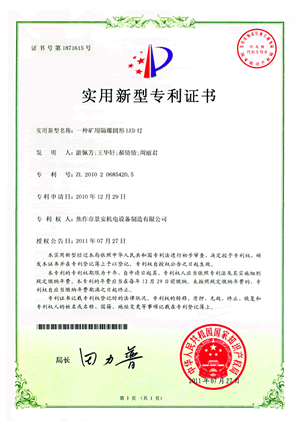 礦用LED直燈專利證書(shū)