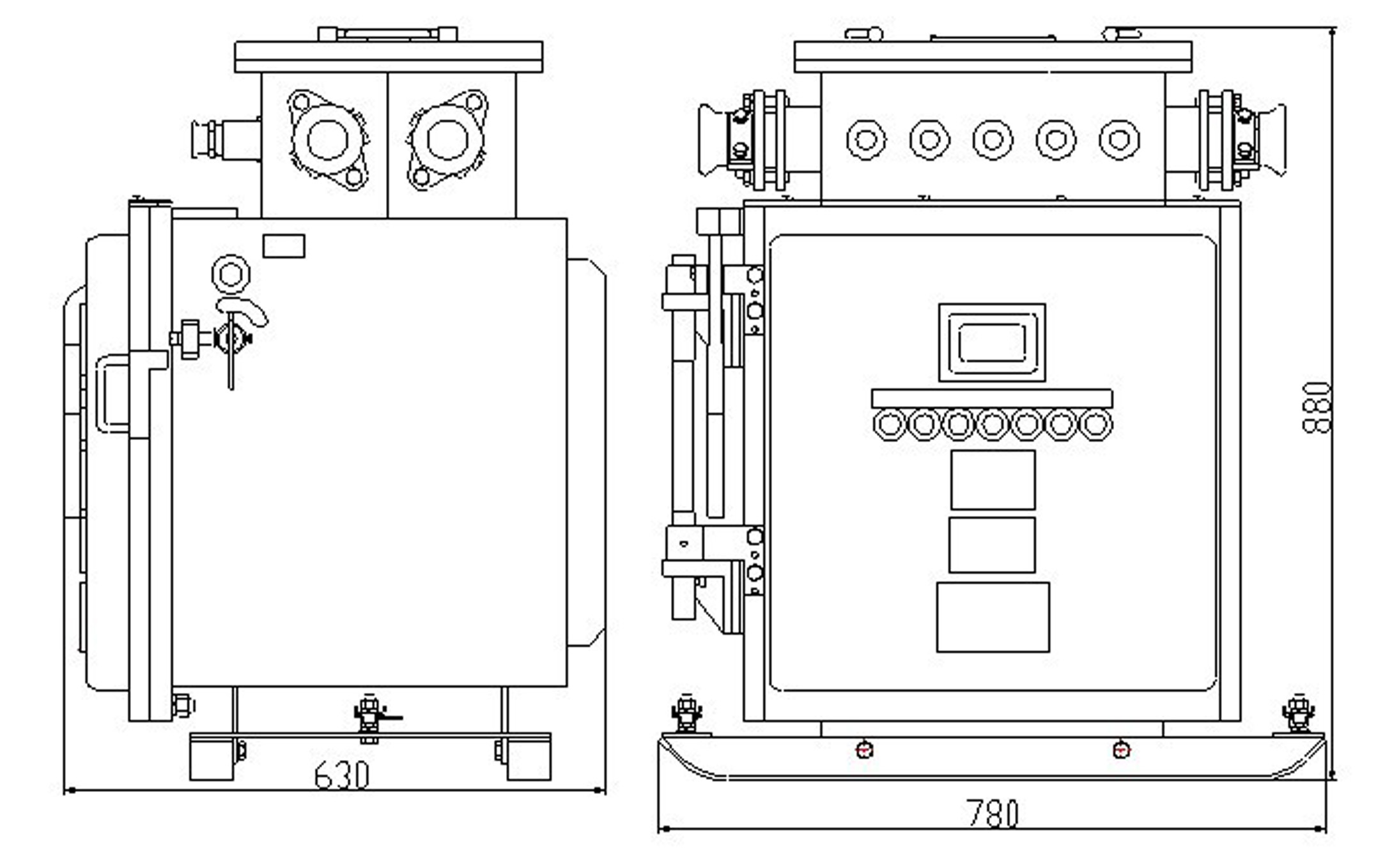 綜合裝置由隔爆外殼、主變壓器和控制部分等組成。隔爆外殼為方形,殼蓋與殼身采用滑動(dòng)止口結(jié)構(gòu),開啟方便。外殼上部的接線箱作為引進(jìn)和引出電纜用,外殼右側(cè)裝有操作組合開關(guān)的手柄,并有可靠的機(jī)械聯(lián)鎖裝置,門蓋上裝有控制按鈕和試驗(yàn)按鈕,門蓋上有一觀察窗,可以從外面觀察到裝置里面液晶漢顯顯示屏的指示狀態(tài)。殼體內(nèi)的控制部分由控制器件板和真空交流接觸器板組成。在控制器件板上裝有微電腦控制器、液晶顯示屏、電流取樣板、電流傳感器、濾波器、電源控制變壓器、試驗(yàn)電阻、保險(xiǎn)等器件。真空交流接觸器板上裝有真空交流接觸器、管式熔斷器,電流互感器,三相電抗器等器件?刂破骷迮c真空交流接觸器板通過一組航空插件及連線構(gòu)成聯(lián)系。防爆外殼箱體內(nèi)裝有主變壓器。